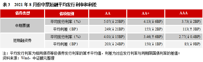 2021年8月份,中期票據的最高發行利率為7.50%,與上月最高發行利率持平;最低發行利率為2.8%,比上月最低發行利率下降10BP。與2021年7月份相比,AA級、AA+級別、AAA級的平均發行利率分別下降25BP、下降6BP和下降2BP;平均利差分別收窄21BP、收窄2BP和擴大3BP。8月份短期融資券的最高發行利率為7.3%,比上月最高發行利率下降30BP;最低發行利率為2.00%,與上月最低發行利率持平。就短期融資券發行級別來看,AA級、AA+級別、AAA級的平均發行利率分別下降15BP、上升6BP和下降0.4BP;平均利差分別收窄24BP、1BP、9BP。