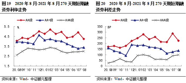 就主要期限品種270天期短期融資券利率和利差走勢來看,2021年8月,AA級、AA+級和AAA級短融平均發行利率分別下行67BP、上行11BP和上行5BP。利差方面AA級、AA+級和AAA級短期融資券平均發行利差分別收窄64BP、擴大12BP和擴大8BP。AA級別利率變動幅度最大,利率下行16BP,AA級別利差變動幅度最大,利差收窄64BP。綜合1-8月利率利差走勢情況來看,短融利率波動下行,利差漲跌互現。