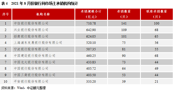 就承銷機構而言,2021年8月共有60家機構參與了銀行間市場的承銷工作。就承銷規模而言,中信銀行以710.78億元的承銷規模位居榜首,興業銀行以642.9億元位居第二,招商銀行以624.05億元的承銷規模位居第三。就承銷數量而言,中信銀行以承銷141只排名第一,興業銀行以承銷109只位列第二。在證券公司類承銷機構中,8月中信建投證券、華泰證券和中信證券的承銷規模位居前三,承銷額分別為249.07億元 、108.22億元和98.83億元。從承銷機構集中度來看,承銷規模排名前十的主承銷商合計規模占比達到56.85%,集中度相對較高。與2021年7月相比,承銷機構數量上升,集中度略有下降。