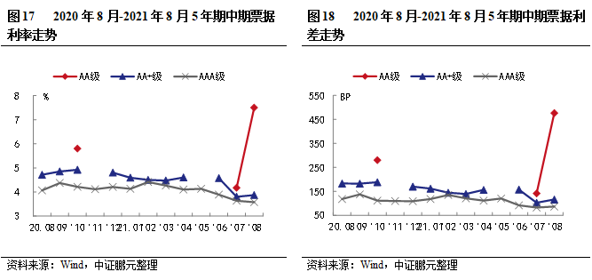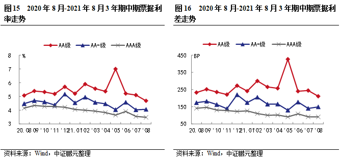 就3年期和5年期中期票據的平均發行利率和平均利差走勢來看,2021年8月,3年期AA級、AA+級和AAA級中期票據平均發行利率較上月分別下行42BP、上行3BP和下行6BP,平均利差分別收窄34BP、擴大9BP和收窄1BP。5年期AA+級和AAA級中期票據平均發行利率較上月分別上行7BP和下行6BP,平均利差分別擴大13BP和擴大4BP。綜合1-8月利率利差走勢情況來看,中期票據利率波動下行,利差走勢收窄。