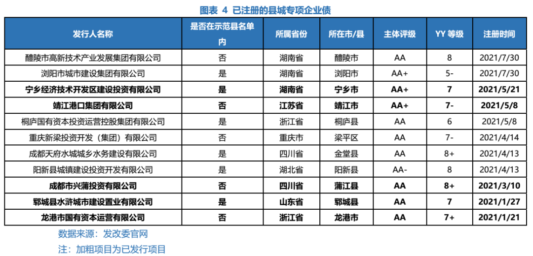 現在,距離縣城專項企業債發行指引正式發布已有一年,我們對縣城專項企業債注冊發行情況繼續跟蹤,目前發行來看不及預期(弱資質+長久期還是比較困難的)。