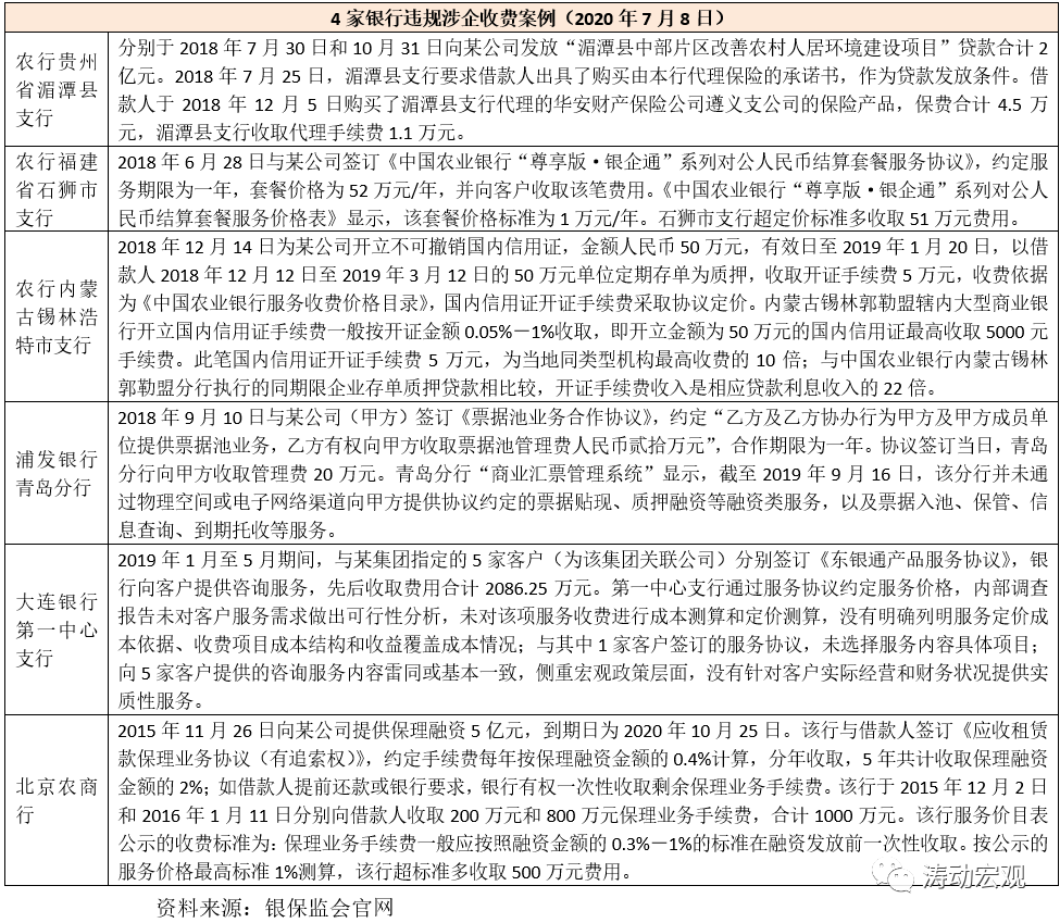 2020年7月8日,銀保監會消費者權益保護發布《關于銀行違規涉企收費案例的通報》,通報了6個違規涉企收費案例,具體涉及農行(3個案例)、浦發銀行、大連銀行以及北京農商行等4家銀行。