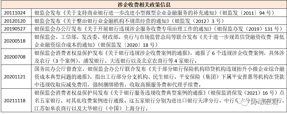 (一)2021年11月18日,銀保監會消費者權益保護局發布《關于銀行服務違規收費典型案例的通報》(銀保監消保發(2021)16號)點名五家銀行,對其涉企違規亂收費案例進行通報。這五家銀行分別為進出口銀行天津分行、中行阜陽分行、浙商銀行、江蘇如皋農商行以及大華銀行(中國)上海分行。