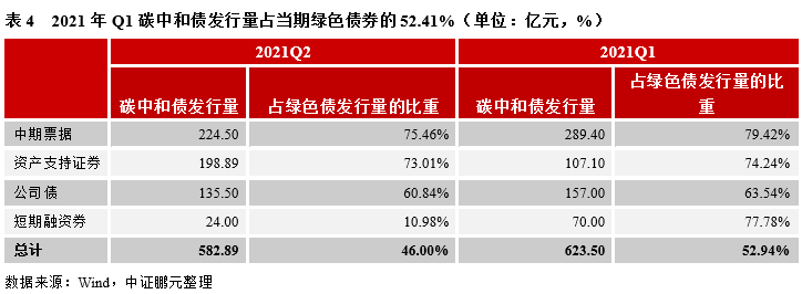 碳中和債角度,2021年Q2碳中和債發(fā)行量與Q1相比,有所下降。分債券品種看,碳中和資產(chǎn)支持證券發(fā)行規(guī)模有所增長,其余碳中和債券品種均有所下降。從碳中和債發(fā)行量占綠色債發(fā)行量的比重看,各品種碳中和貼標的積極性均有所下降,短期融資券碳中和貼標的積極性下降最明顯,或許是出于成本考慮,碳中和債券需要第三方機構(gòu)的評估認證。