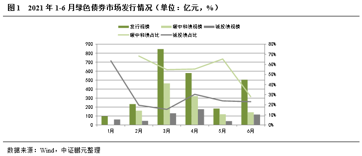 2021年上半年國內(nèi)市場共發(fā)行綠色債券2,444.96億元,與去年下半年相比,環(huán)比增長113.94%,已超過去年全年綠色債券市場發(fā)行規(guī)模。上半年綠色債券發(fā)行集中在3月、4月和6月。作為今年綠色債券市場的最大亮點,上半年碳中和債共發(fā)行1,206.39億元,占綠色債券總體發(fā)行規(guī)模的49.34%,分月度來看,6月份碳中和債的貼標積極性有所減弱。