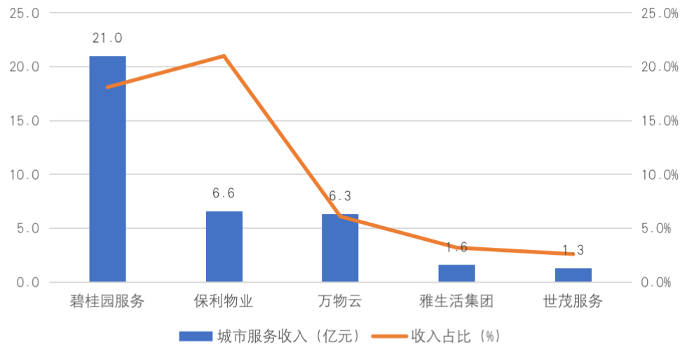“城市服務”已然成為了物企業爭相布局的藍海賽道,但從企業經營數據來看,該業務仍處于起步階段。截至2021年6月30日,碧桂園服務的城市服務營收最高,達到21.0億元,其余企業均不超過10億元。在城市服務收入占總收入的比例上,除了碧桂園服務和保利物業外,企業該業務的收入占比均不超過10%。