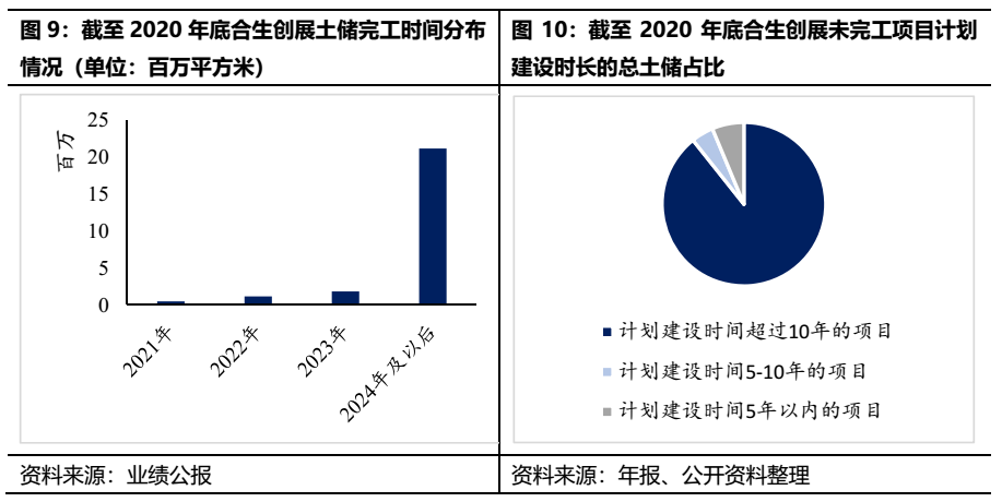 目前,由于歷史囤積的慢去化土儲規模很大,合生整體的項目周期依然很長。截至2020年底,公司披露的項目總計87個,其中未完工的項目53個,這些項目中未完工面積占比高達90.67%。時間節點上看,以上絕大多數的未完工面積都將于2024年及以后完工,項目周期之長顯而易見。而進一步對這些未完工項目進行整理,發現約89%的項目開發時間超過10年,部分在廣州、惠州、北京的土儲拿地時間超過了20年,這些土地當年的拿地成本很低,并且區位均較好,未來隨著這部分土儲逐漸建設銷售,勢必會帶來很高的溢價。