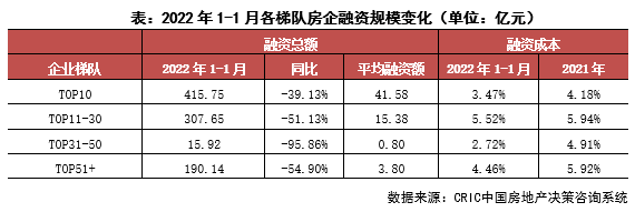 企業表現:本月融資總量最高的企業為萬科地產,融資總量約124.16億元,主要是發行了30億元的中期票據,此外進行了資產證券化產品的發行。從企業梯隊來看,2022年1月TOP10房企融資平均額41.58億元最大,融資總額同比下降39.13%,下降幅度最?。籘OP31-50房企融資額僅有15.92億元,該梯隊進行融資的企業相對較少。成本來看,TOP31-50梯隊的房企融資成本最低,為2.72%,其較2021年全年下降2.19pct,降幅最大;而TOP11-30的融資成本最高,為5.52%。