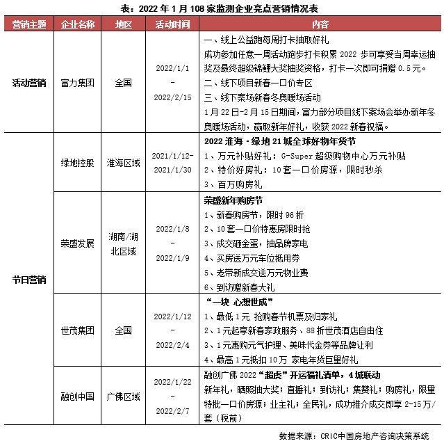 1月房企營銷的主要方式仍然是依托節日主題展開活動,市場低迷之下,消費者信心不強,房企也鮮有大規模促銷活動。本月的折扣力度有所減小,普遍維持在95折之上,少數特價房和清尾房折扣有所下探。從營銷方式來看,面對當下的行情,房企也難以通過營銷扭轉趨勢,因此活動形式上仍以借助節日熱度推出常規的活動為主,包含到訪禮,折扣營銷、特價房等。富力營銷端較為積極,2021年底碧桂園曾推出步數打卡的互動型互動,本月富力參照這一形式推出了“線上公益跑每周打卡抽取每周好禮”,同樣意在增強互動性調動消費者積極性。
