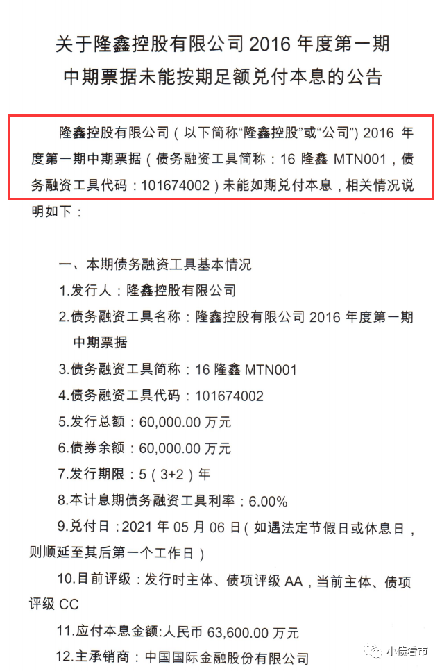 據(jù)公開(kāi)資料,“16隆鑫MTN001”發(fā)行于2016年,當(dāng)期總額6億元,期限3+2年,票息6%,應(yīng)于今年5月6日到期。