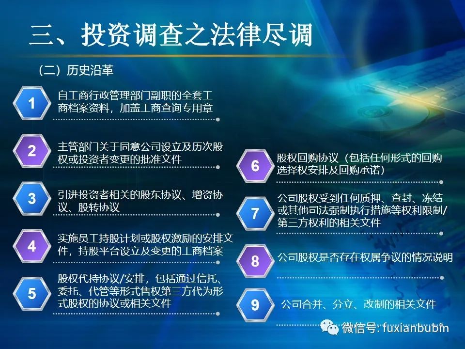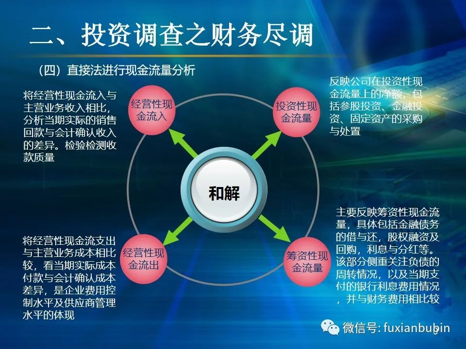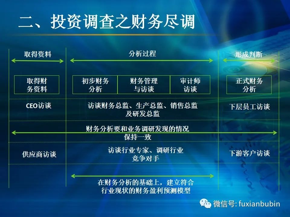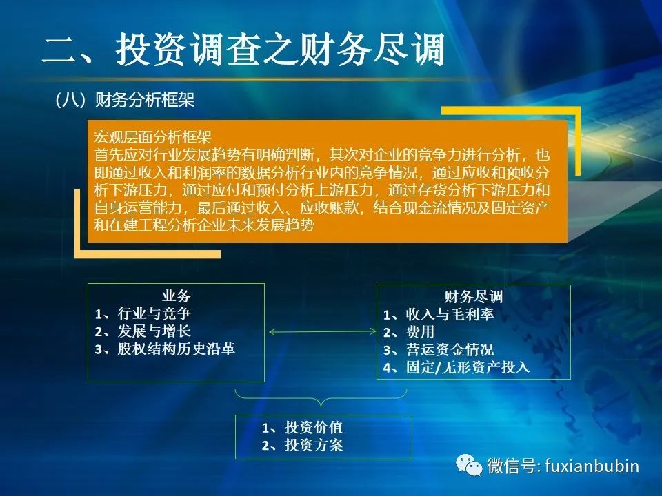 私募股權投資基金的投資工作,其業務流程主要圍繞投資決策開展,通常包括項目開發與篩選,初步盡職調查,項目立項、簽訂框架投資協議、盡職調查、投資決策、簽署投資協議、投資交割等主要環節。在這一過程中,財務盡調主要關注目標公司的歷史財務業績的情況,并對未來財務狀況進行合理預測。調查內容包括企業的歷史經營業績,未來盈利預測、營運資金、融資結構、資本性開支以及財務風險敏感度分析等。其作用在于為投資及整合方案設計、交易談判、投資決策提供支撐,進而判斷投資是否符合戰略目標及投資原則。法律盡職調查是對相關法律事務具有法律意義的背景資料進行應有的調查,使相關法律事務的處理建立在客觀、全面的信息基礎之上,以確保相關法律事務的處理能夠達到預期的結果,而不因相關信息在真實性、完整性、全面性、合法性等方面的原因影響預期目標的實現。經過財務盡調與法律盡調,在股權投資之前,需要考慮該項投資的性質、事實和背景,為之選擇恰當的估值方法,并結合市場參與者的假設,采用合理的市場數據和參數對目標公司進行估值,明確目標公司的公允價值。