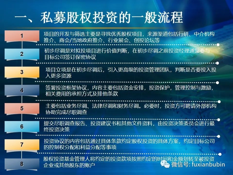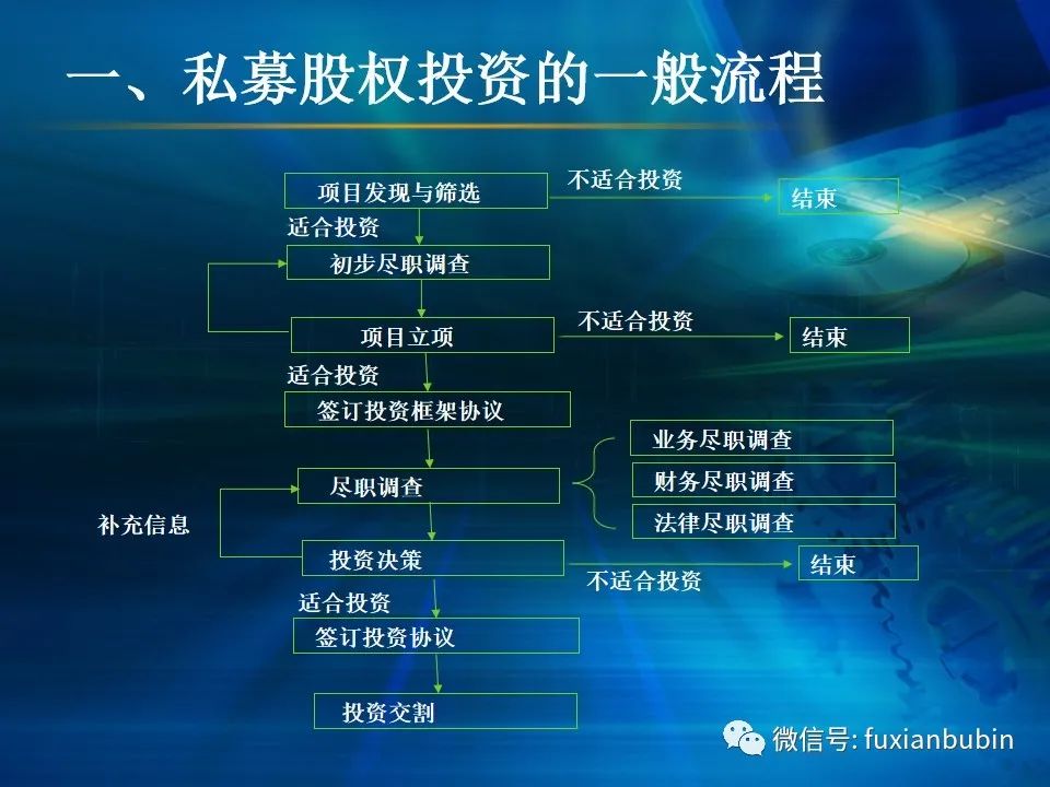 私募股權投資基金的投資工作,其業務流程主要圍繞投資決策開展,通常包括項目開發與篩選,初步盡職調查,項目立項、簽訂框架投資協議、盡職調查、投資決策、簽署投資協議、投資交割等主要環節。