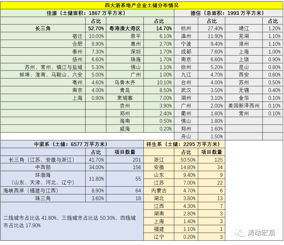 從土儲分布情況來看,這四家在上海本地的拿地比例均不高,其它方面也有一些自己的特色,如德信比較集中,中梁系主要在二三線城市、祥生系聚焦于浙江與安徽兩大地區(qū),佳源則相對較為分散。