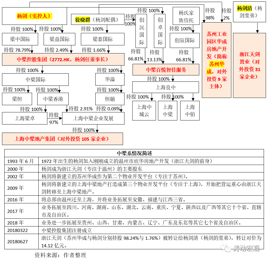 2、中梁系有五家運作主體,具體包括中梁控股集團(港股上市)、中梁百悅智佳服務(wù)(物業(yè)公司)、上海中梁地產(chǎn)集團(中梁的國內(nèi)運作主體)以及蘇州華成和浙江天劍(2018年6月以14.12億元的對價轉(zhuǎn)讓給楊劍清)。
