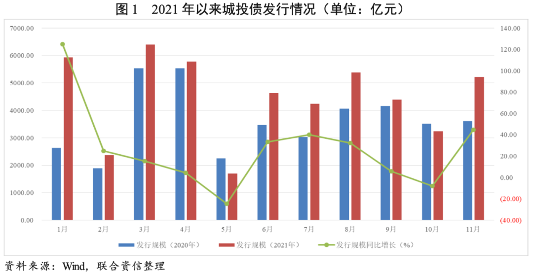2021年以來,城投企業(yè)融資政策收緊,但市場流動性仍保持整體寬松,同時產(chǎn)業(yè)類債券尤其是房企債券信用風險持續(xù)暴露,導致一級市場出現(xiàn)結構性資產(chǎn)荒,綜合影響下,城投債發(fā)行規(guī)模持續(xù)增長。2021年1-11月,發(fā)行城投債的主體數(shù)量同比增長7.78%,城投債發(fā)行數(shù)量及發(fā)行規(guī)模同比分別增長34.17%和24.12%,仍保持增長態(tài)勢,但增速較上年同期(74.15%和67.84%)均明顯回落。具體來看,除5月份和10月份城投債發(fā)行規(guī)模小于上年同期外,其他月份均高于上年同期水平。國發(fā)〔2021〕5號文及交易所公司債審核指引于4月份集中發(fā)布,嚴監(jiān)管下5月份城投債發(fā)行規(guī)模較上年同期下降24.61%;10月份,房企債務違約影響持續(xù)發(fā)酵疊加節(jié)假日因素,城投債發(fā)行規(guī)模較上年同期下降8.02%。