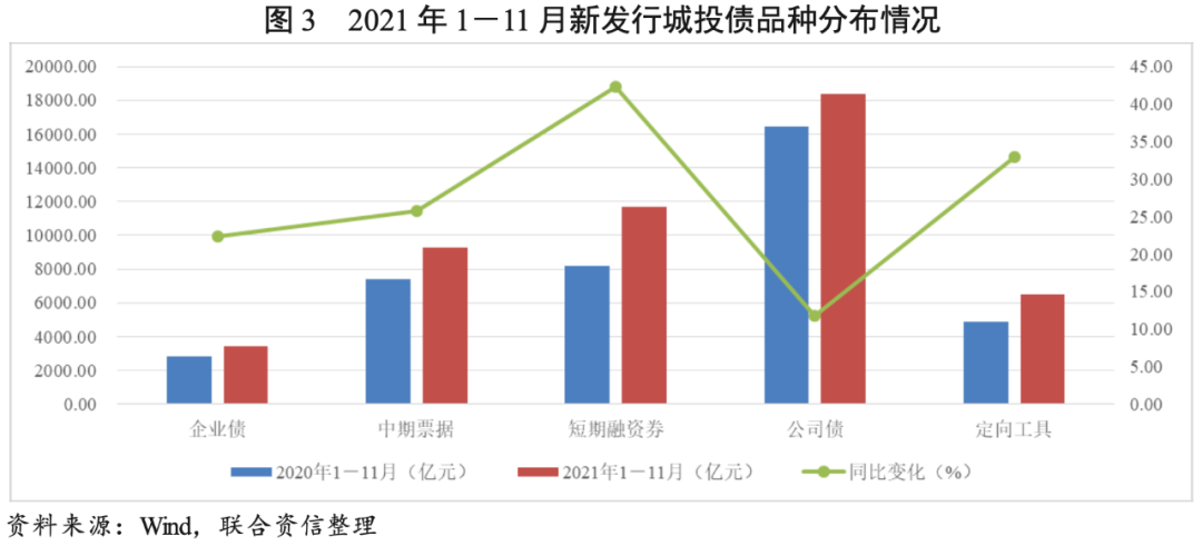 從發(fā)行品種來看,2021年1-11月,新發(fā)行城投債以公司債(占37.25%、)、短期融資券(占23.71%)和中期票據(jù)(占18.84%)為主,受滬深交易所收緊城投債發(fā)行審核條件影響,公司債發(fā)行規(guī)模占比較上年同期的41.36%下降4.11個百分點,發(fā)行規(guī)模增速由上年同期的117.91%大幅回落至11.79%。短期融資券發(fā)行規(guī)模較上年同期繼續(xù)保持較快增長,發(fā)行規(guī)模占比較上年同期的20.68%提升3.03個百分點,融資政策收緊引發(fā)市場對部分地區(qū)城投企業(yè)償債能力擔憂,風險偏好有所下降,對短期限產(chǎn)品更為青睞。