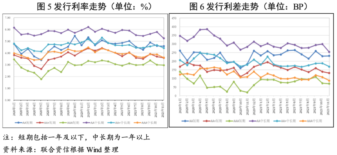 2021年以來,債券市場資金面表現(xiàn)為“先邊際收緊后逐步放松”。具體來看,2021年上半年,隨著國內(nèi)疫情形勢趨于穩(wěn)定,經(jīng)濟穩(wěn)步復蘇,債券市場資金面延續(xù)了2020年下半年以來邊際收緊的趨勢;2021年下半年,隨著央行全面降準以及下調(diào)金融機構存款準備金率等釋放流動性,市場資金面趨緊態(tài)勢有所回暖。受市場流動性變化的綜合影響,2021年1-11月,不同期限債券的發(fā)行利率和發(fā)行利差走勢呈現(xiàn)分化,短期城投債的發(fā)行利率和發(fā)行利差較2020年均有所上升,中長期城投債的發(fā)行利率變化不大、發(fā)行利差均有所下降。不同地區(qū)城投債發(fā)行利差分化較為明顯。
