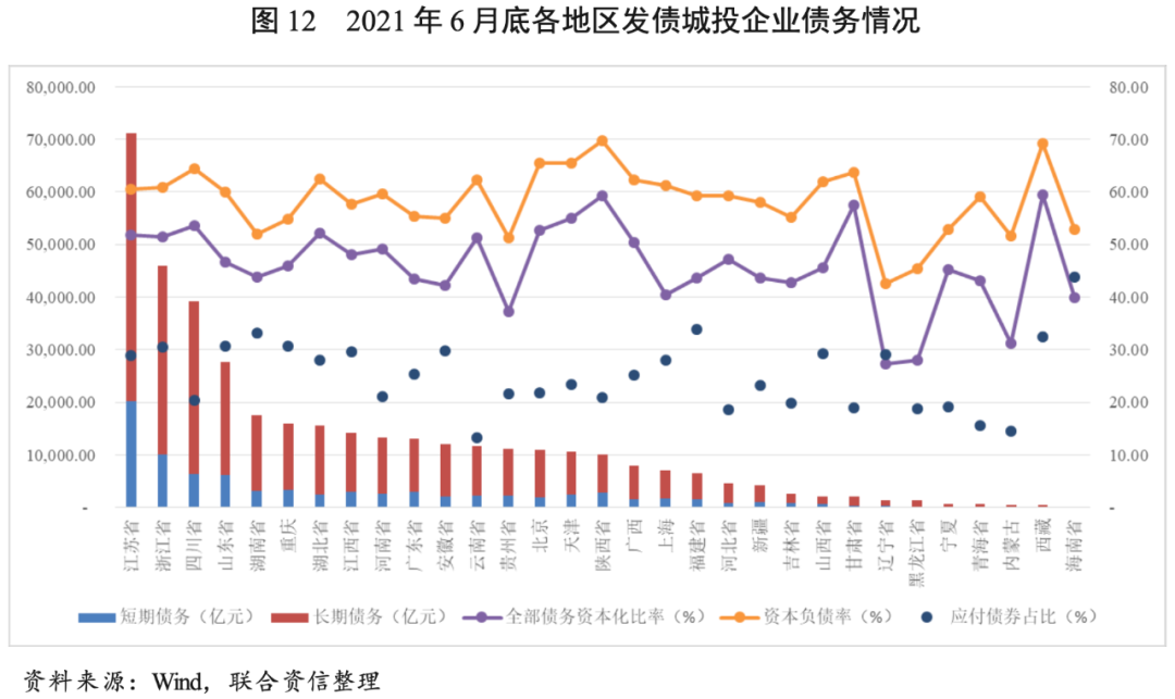 具體來看,截至2021年6月底,江蘇、浙江和四川發(fā)債城投企業(yè)有息債務規(guī)模位列前三,東三省、西北部省份及海南省發(fā)債城投企業(yè)債務規(guī)模較小。福建、湖南、西藏、重慶、山東及浙江等地應付債券占比均超過30%,對債券融資的依賴度相對較大;隨著到期債券逐步償還,云南、內(nèi)蒙古、青海、黑龍江、甘肅、寧夏等地債券融資占比下降至較低水平。債務負擔方面,陜西、甘肅、天津和四川等發(fā)債城投企業(yè)債務負擔較重,遼寧、黑龍江、內(nèi)蒙古、貴州和海南發(fā)債城投企業(yè)債務率水平較低,但實際債務負擔需結合具體城投企業(yè)資產(chǎn)質(zhì)量進行甄別分析。