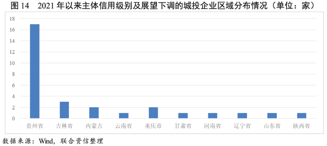 監(jiān)管趨嚴、融資政策收緊對政府債務負擔較重地區(qū)的弱資質(zhì)城投企業(yè)產(chǎn)生更大負面影響。2021年以來,主體信用等級及展望下調(diào)的城投企業(yè)數(shù)量明顯增加,包括主體信用等級下調(diào)10家,展望下調(diào)20家,下調(diào)原因主要包括區(qū)域經(jīng)濟及財力下滑,短期償付壓力大,出現(xiàn)欠息、代償以及非標逾期等風險事件。其中,主體信用級別下調(diào)至AA-的主體居多,占50.00%;從地域分布看,貴州省主體信用級別及展望下調(diào)的城投企業(yè)最多(共計17家),其次為吉林省(共計3家)。