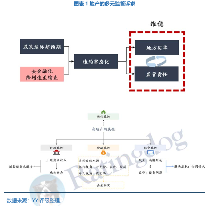 在21年圣誕節前夕的地產黑夜與黎明路演中我們曾說道,這一輪大周期的中樞為政策的去金融化,其造成的成本外溢和市場頻繁違約將促使監管機構間的執行與糾偏,從而使得市場面臨持續性的短中期波動。而如何看待機構間的立場與政策解讀成為也將成為后續解讀短期擾動因素的主要工具。