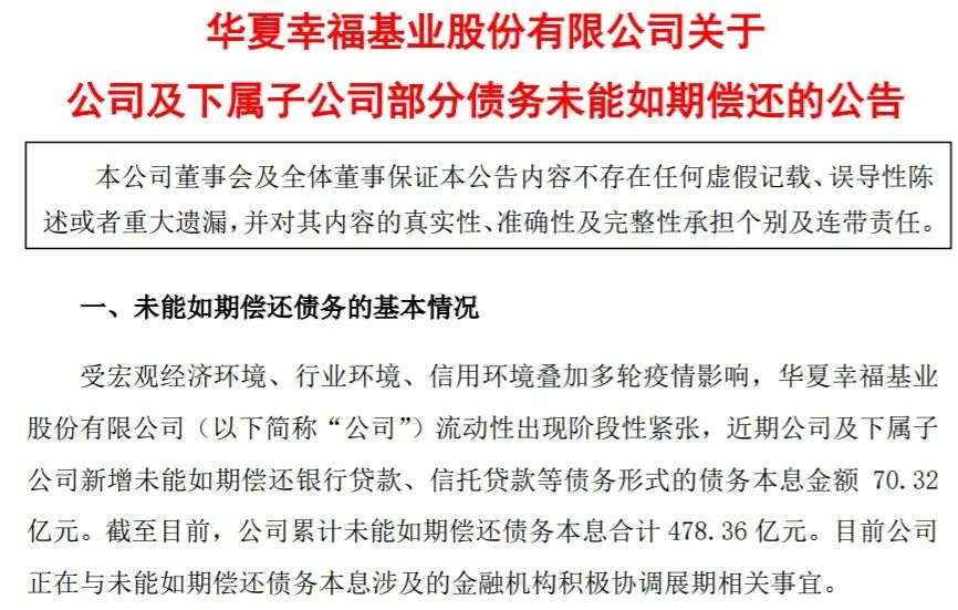 6月11日,華夏幸?;鶚I(yè)股份有限公司公告,近期公司及下屬子公司新增未能如期償還銀行貸款、信托貸款等債務(wù)形式的債務(wù)本息金額67.87億,累計(jì)未能如期償還債務(wù)本息合計(jì)635.72億元。
