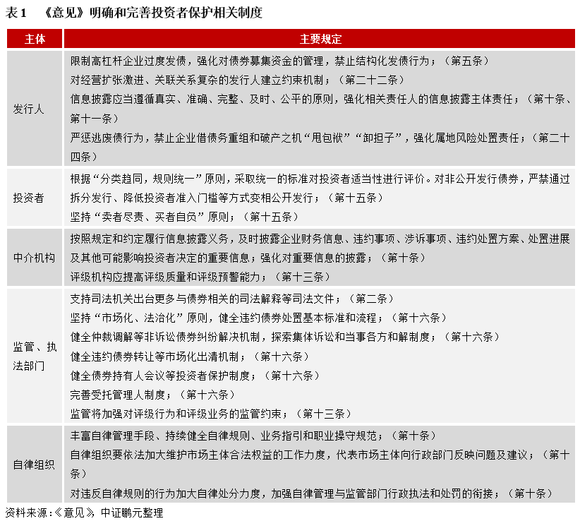 法律法規是實現市場有序發展的基礎,由于我國債券市場發展時間較短,相關制度有待完善。隨著信用風險的逐步顯露和債券市場的對外開放需求,推動法治統一成為債券市場健康發展的基礎。根據《意見》,債券市場的法律安排將按照“分類趨同、規則統一”的原則進行,即根據發行方式,分類監管。第一,統一法律基礎?!兑庖姟奉C布前,非金融企業債務融資工具參照《人民銀行法》進行管理,此次明確《公司法》和《證券法》是公司信用類債券市場的基礎法律,實現了全市場公司信用類債券法律標準的統一。第二,統一司法處置標準。《意見》指出,在民商事審判工作中,對企業債券、非金融企業債務融資工具、公司債券適用相同的法律標準,第三,明確統一執法權,由國務院證券監督管理機構依法對違法違規行為進行認定和處罰。第四,將逐步統一債券市場各類制度和執行標準,包括債券發行交易、信息披露、信用評級、投資者適當性、風險管理等。其中,明確對非公開發行公司信用類債券的各項制度進行統一規范,以降低信息不對稱帶來的投資者利益損失。