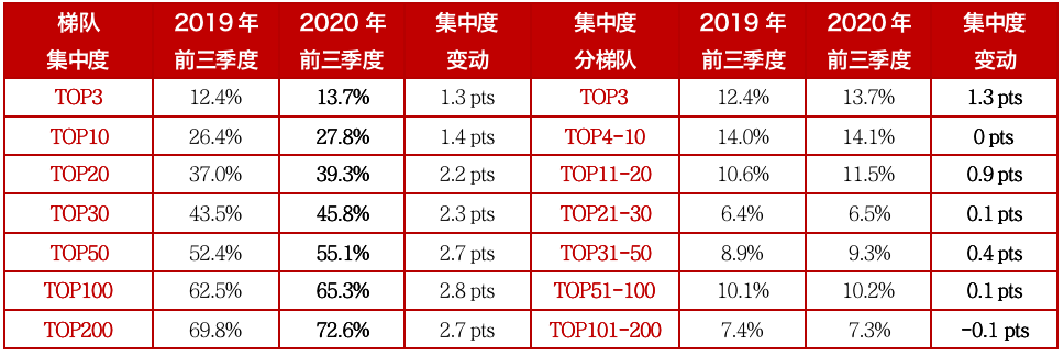表:2020年前三季度TOP200各梯隊房企銷售操盤金額集中度