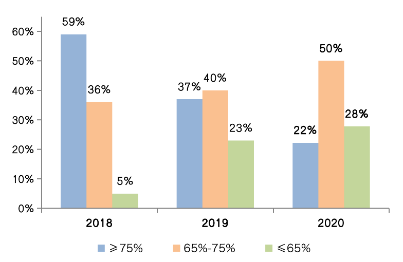 2020年,房企業績目標的完成情況一定程度上受到疫情影響,整體表現不及2018、2019年同期。
