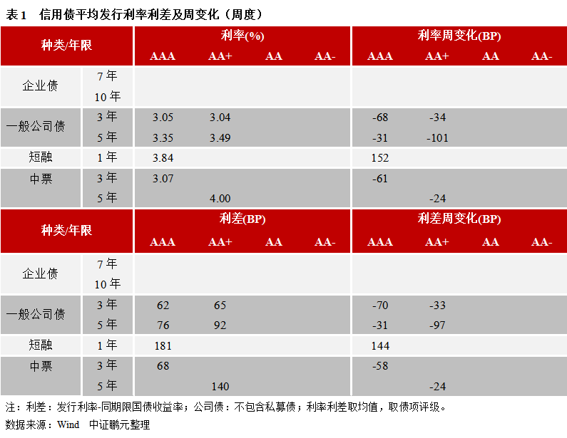 原標(biāo)題: 上周信用債發(fā)行規(guī)模和凈融資規(guī)模環(huán)比下降85%和163%,主要信用品種收益率下行、利差收窄