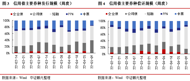 上周(2022/05/09-2022/05/15)信用債(包括企業(yè)債、公司債、中期票據(jù)、短期融資券和定向工具)發(fā)行規(guī)模為699.03億元,較前一周下降85%;償還規(guī)模為1,159.40億元,較前一周下降70%;凈償還460.37億元,較前一周下降163%。上周債項(xiàng)評(píng)級(jí)中,AAA、AA+級(jí)別債券分別占比60%、33%,較前一周減少0.1個(gè)百分點(diǎn)、增加4.3個(gè)百分點(diǎn)。
