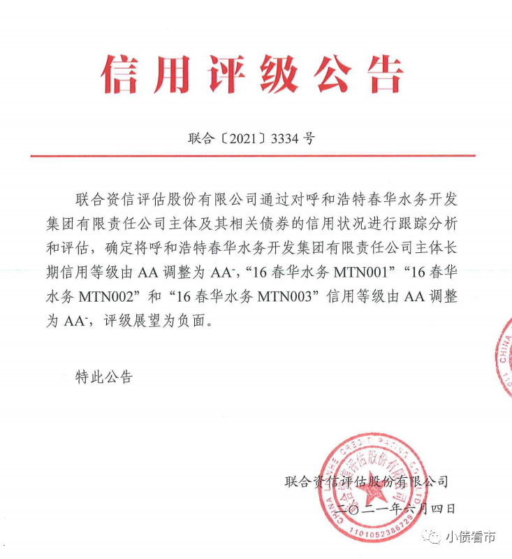 6月4日,聯(lián)合資信公告稱,將呼和浩特春華水務(wù)開發(fā)集團有限責任公司(以下簡稱“春華水務(wù)”)主體和相關(guān)債項信用等級由AA調(diào)整為AA-,評級展望為負面。