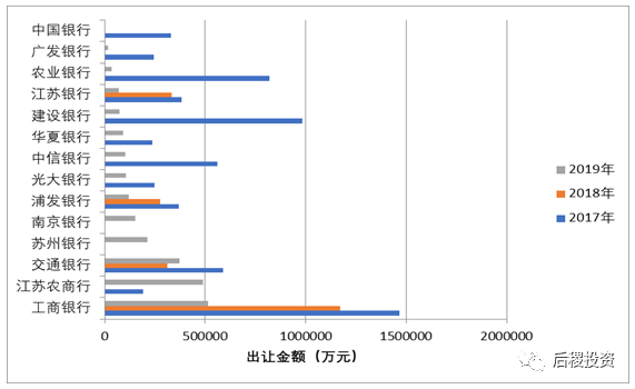 從上圖所知,華融資產、長城資產、江蘇資產位列前三甲,且出讓金額均超過40億元;相比2018年,信達資產和東方資產情況截然相反,分別減幅和增幅近半。成立于2016年5月底的蘇州資產,17年沒有出讓記錄,這兩年出讓金額穩定在20億左右。