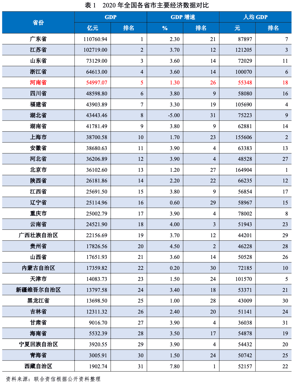 河南是我國農(nóng)業(yè)大省,近年來,在中國經(jīng)濟(jì)增速持續(xù)放緩的背景下,河南省經(jīng)濟(jì)持續(xù)增長,但增速亦有所放緩。2018-2020年,河南省分別實現(xiàn)地區(qū)生產(chǎn)總值(GDP)48055.86億元、54259.20億元和54997.07億元,2020年經(jīng)濟(jì)總量居于全國第5位。同期,河南省GDP增速分別為7.6%、7.0%和1.3%,2020年GDP增速低于全國GDP增速(2.3%)1.0個百分點,位居全國第26位。2020年,河南省人均GDP(5.53萬元)為全國平均水平的0.76倍,位居全國第18名。