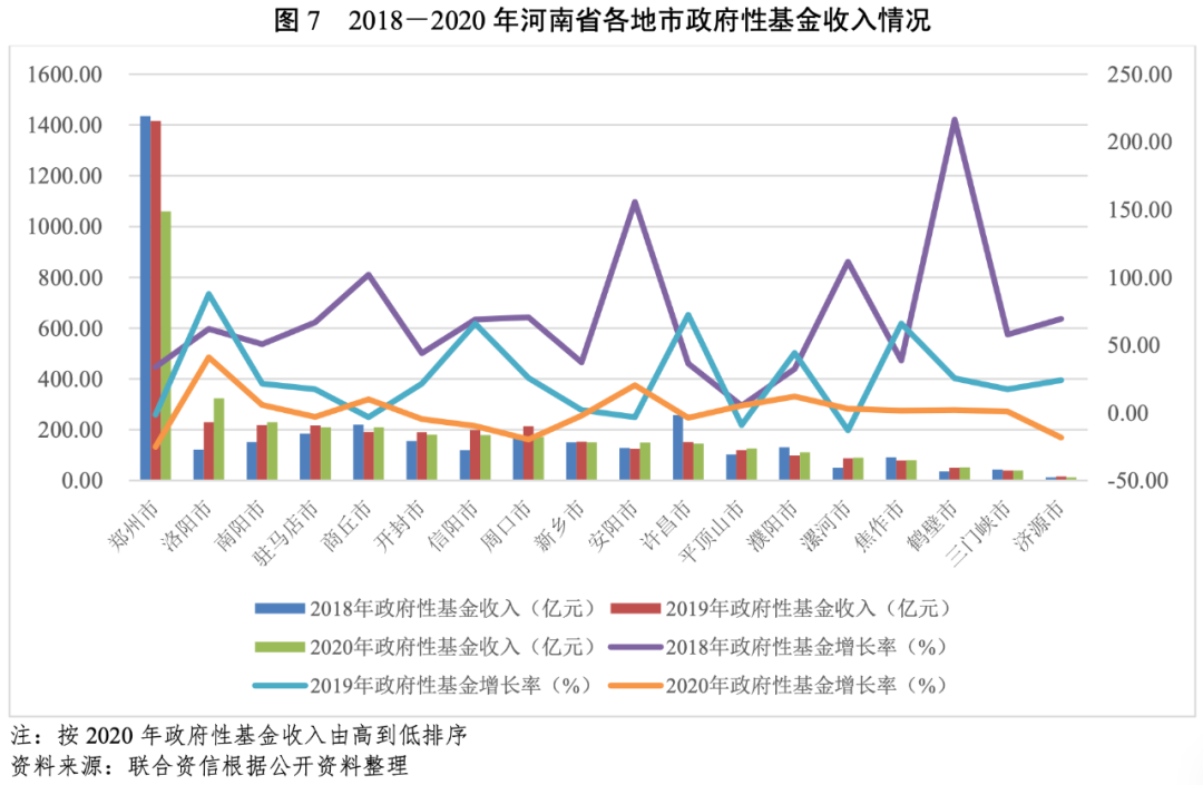 政府性基金收入方面,鄭州市政府性基金收入規(guī)模最高,2018-2020年政府性基金收入均超1000億元,占全省政府性基金收入的比例分別為37.50%、34.69%和28.34%。2020年,除鄭州市以外,其他地市政府性基金收入較大的有洛陽市、南陽市、駐馬店市和商丘市,規(guī)模均超過200億元;較小的為濟(jì)源市和三門峽市,規(guī)模均在50億元以下。從政府性基金收入增速來看,2020年,洛陽市、安陽市和濮陽市政府性基金收入同比增長較快,其中洛陽市增速最高,達(dá)40.91%;有14個地市政府性基金收入增速較2019年有所下降,其中8個地市政府性基金收入較2019年有所下降,其中,鄭州市、周口市和濟(jì)源市2020年政府性基金收入同比分別下降25.15%、19.65%和18.30%,降幅較大。