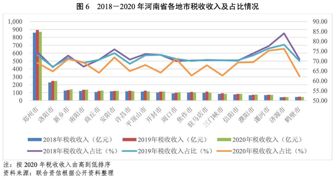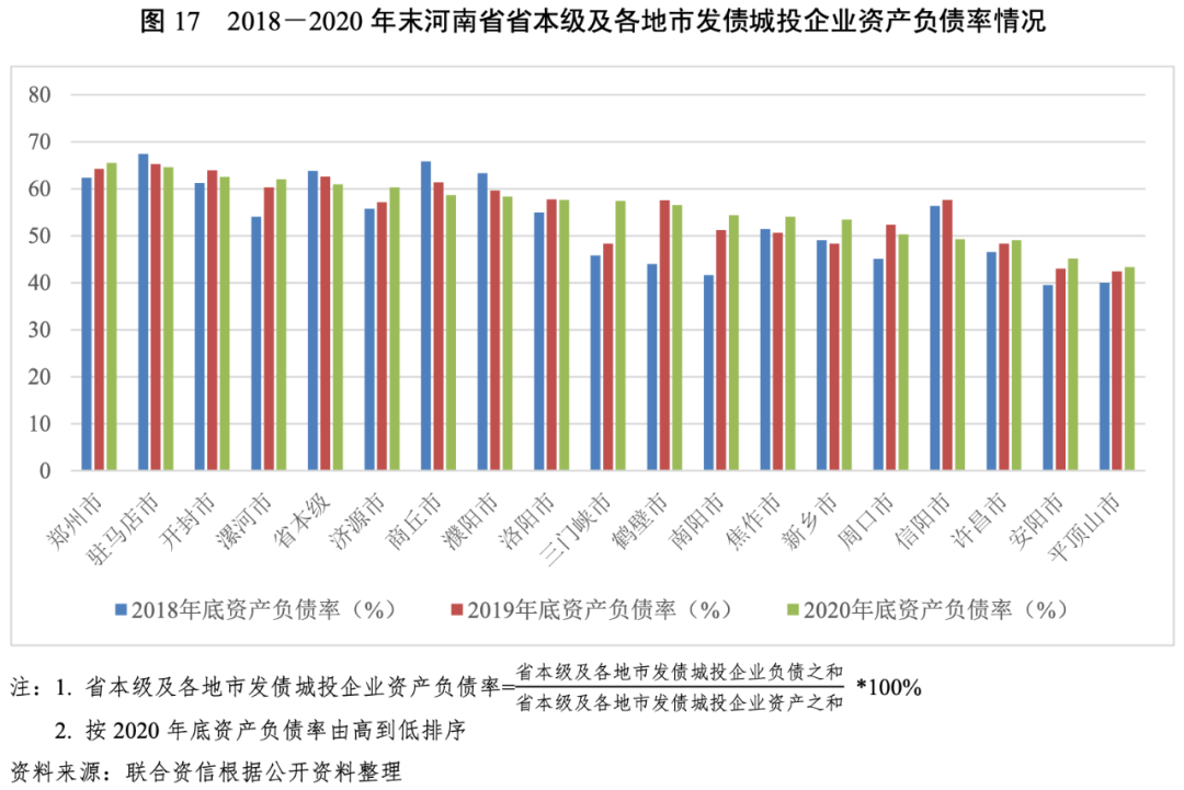 從地市層面看,河南省下轄各地市經(jīng)濟(jì)發(fā)展和財力水平分化較為明顯,整體呈“中心強、四周弱”的發(fā)展格局,鄭州市作為省會城市和全省經(jīng)濟(jì)中心,GDP規(guī)模較大且保持穩(wěn)定增長,其他地市經(jīng)濟(jì)發(fā)展水平與之差距較大。河南省各地市一般公共預(yù)算收入穩(wěn)定性較強,除鄭州市、濟(jì)源市和洛陽市以外,其他各地市財政自給能力較弱。2018-2020年末,河南省各地市政府債務(wù)余額均呈上升趨勢,其中,信陽市、駐馬店市、許昌市和焦作市等地市債務(wù)余額增速較快。截至2020年底,河南省各地市政府負(fù)債率較上年底均有所增長,河南省各地市政府債務(wù)負(fù)擔(dān)處于尚可和較輕水平,但政府債務(wù)率差異較大。