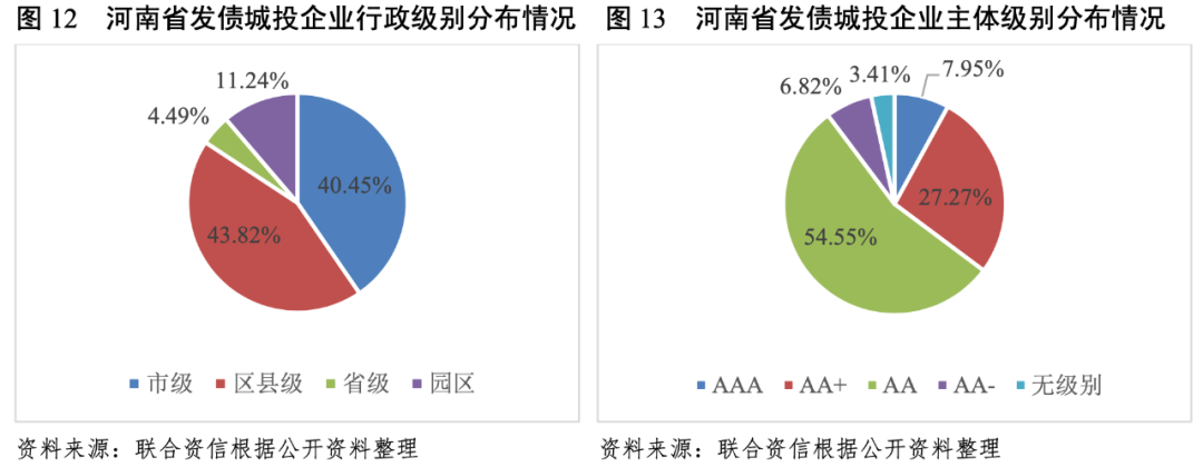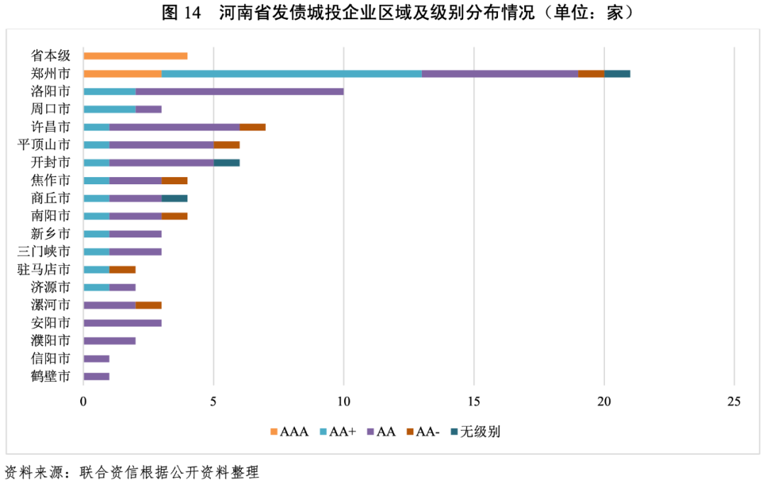 河南省下轄18個地市(含省直管市濟(jì)源市)均有發(fā)債城投企業(yè),城投企業(yè)行政級別以區(qū)縣級和地市級為主,發(fā)債城投企業(yè)主要分布在省會鄭州以及洛陽、許昌、開封和平頂山等省會周邊地市,其中,鄭州市發(fā)債城投企業(yè)數(shù)量最多、信用等級較高。河南省發(fā)債城投企業(yè)主體級別以AA級為主,高級別城投集中在省本級及鄭州市。