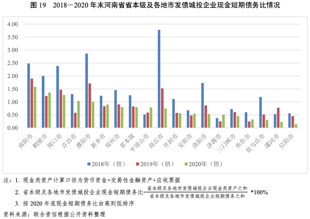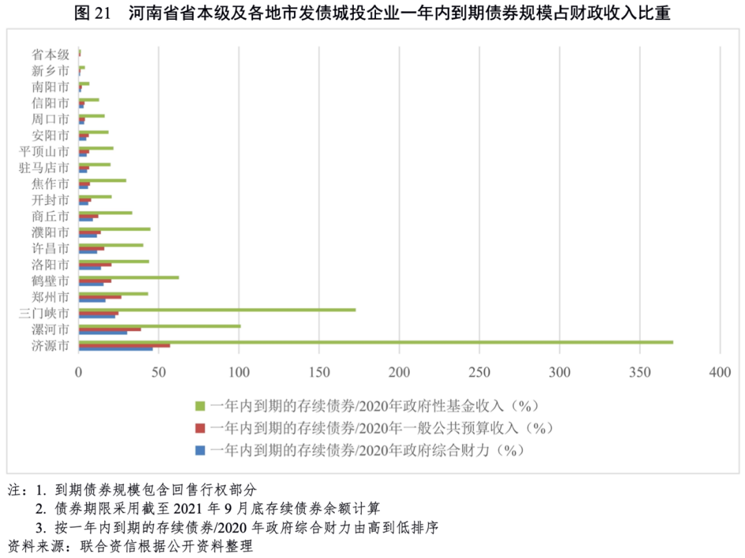 從地方政府財力對“發(fā)債城投企業(yè)全部債務(wù)+地方政府債務(wù)”的保障能力來看,截至2020年底,鄭州市、三門峽市、許昌市和濟(jì)源市“發(fā)債城投企業(yè)全部債務(wù)+地方政府債務(wù)”/地方政府綜合財力均超過200%,其次為開封市、平頂山市、商丘市、洛陽市、濮陽市和鶴壁市,均超過160%。信陽市、南陽市、周口市和駐馬店市一般公共預(yù)算收入對“發(fā)債城投企業(yè)全部債務(wù)+地方政府債務(wù)”的保障能力相對較高,鄭州市、省本級、許昌市和濟(jì)源市等相對偏低。從“發(fā)債城投企業(yè)全部債務(wù)+地方政府債務(wù)”/政府性基金收入來看,政府性基金收入對“發(fā)債城投企業(yè)全部債務(wù)+地方政府債務(wù)”覆蓋程度相對較低的地市為三門峽市和濟(jì)源市。