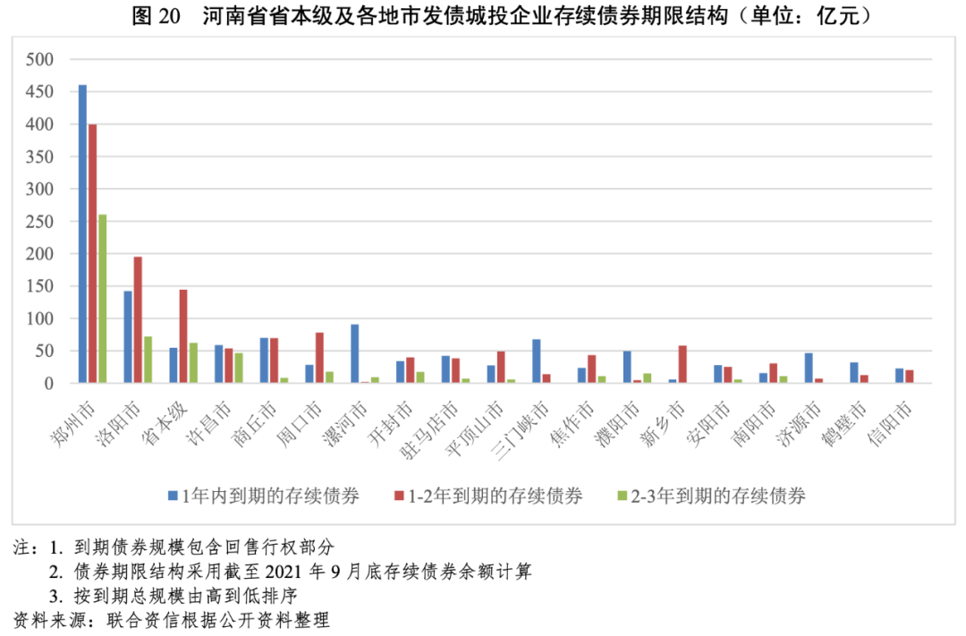從河南省發(fā)債城投企業(yè)存續(xù)債券期限結(jié)構(gòu)來看,截至2021年9月底,河南省發(fā)債城投企業(yè)存續(xù)債券中將于未來一年內(nèi)及一至兩年內(nèi)到期的債券規(guī)模均超過1200億元,占存續(xù)債券余額總量的比重超過35%。具體來看,鄭州市、洛陽市和省本級發(fā)債城投企業(yè)未來三年集中到期債券規(guī)模大,鄭州市發(fā)債城投企業(yè)存續(xù)債券中未來一年內(nèi)到期規(guī)模超過450億元,集中兌付壓力較大;信陽市、鶴壁市和濟(jì)源市等地市發(fā)債城投企業(yè)未來三年到期債券規(guī)模相對較小,但考慮到上述地市發(fā)債城投企業(yè)存續(xù)債券余額小,仍需關(guān)注其集中兌付情況。