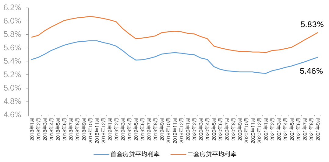 從全國房貸利率來看,受銀行信貸收緊影響,今年2月開始,全國房貸利率全面止跌回升,并趨勢性上移。據CRIC調研數據,2021年9月,全國首套房平均房貸利率5.46%,較2020年底上漲23BP,二套房貸款平均利率5.83%,較2020年底上漲29BP。