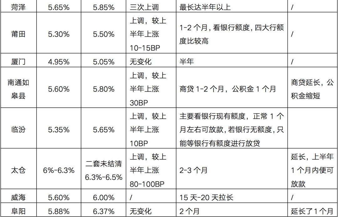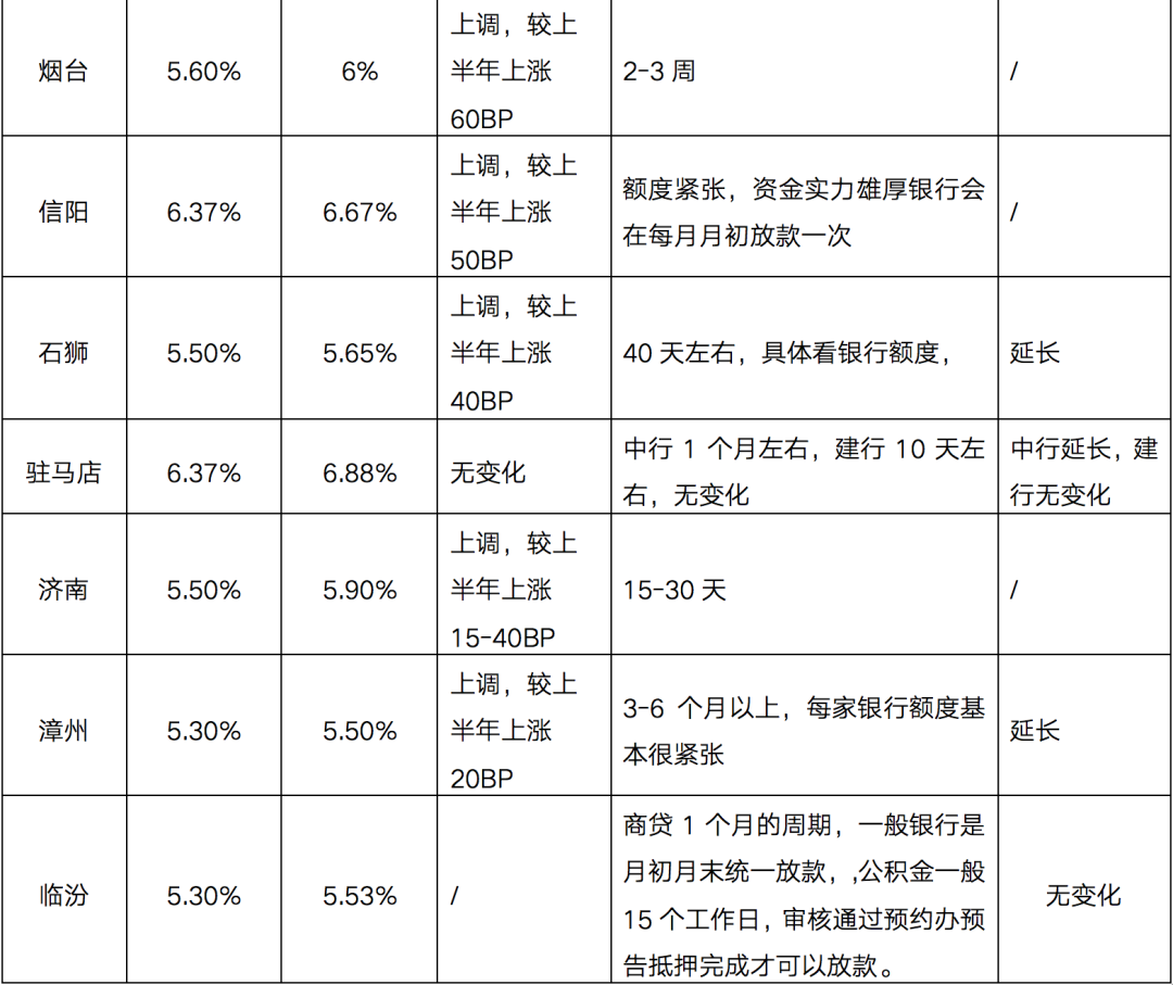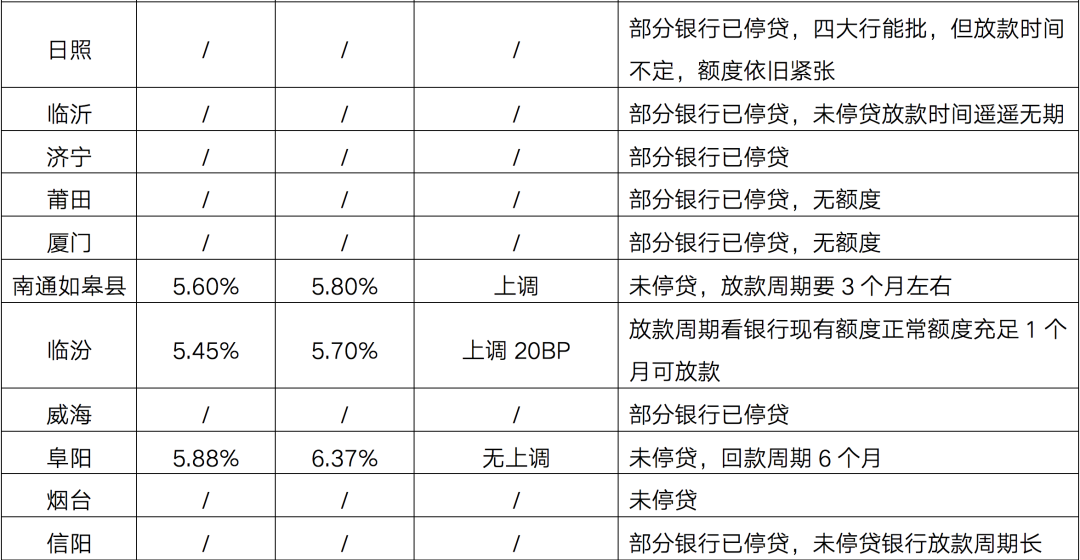 綜合來看,3-6個月的放款周期已成為常態,臨沂、濟寧、菏澤等山東地市放款周期高達半年以上,還有部分諸如蘇州、泰州、鹽城等信貸端全面收緊,放款時間不定。